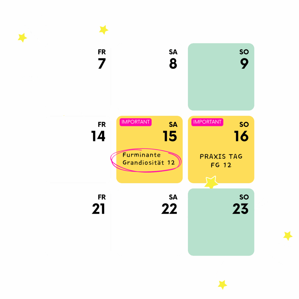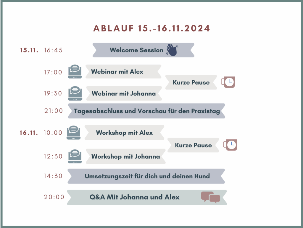 Am 15. November ab 16:45 Uhr werden wir in zwei Webinaren die theoretischen Hintergründe zum Thema Frust beleuchten. Am 16. bringen wir das erlernte in die Praxis und starten den Tag um 10:00 Uhr. Nach zwei praxisreichen Online Workshops werden die Teilnehmenden Zeit für die Umsetzung haben, um am Abend in einem umfangreichen Q&A Feedback zu erhalten und offene Fragen zu stellen.